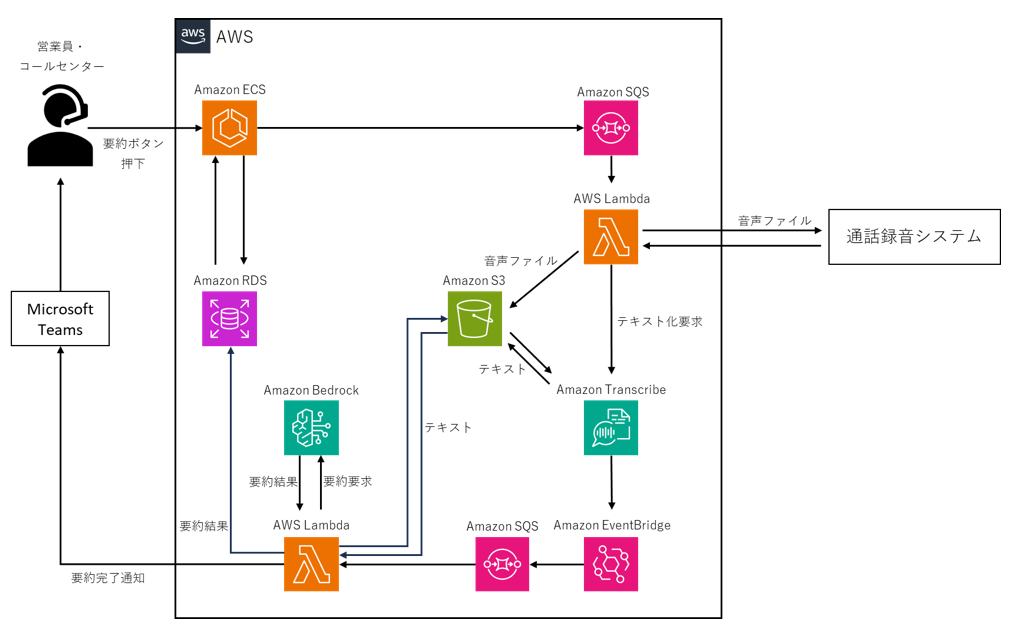 通話録音データのテキスト化は、Amazon Transcribe(※1)で行い、テキストデータの要約はAmazon Bedrock(※2)のAIモデルを用いた。要約完了後は、Microsoft Teamsでチャットを送ることで、営業事務へ要約完了を知らせる機能を構築した。こちらの処理には数分かかるため、メッセージキューサービスのAmazon SQS(※3)やサーバーレスのコード実行サービスであるAWS Lambda(※4)を用いることで、非同期処理を実現した。