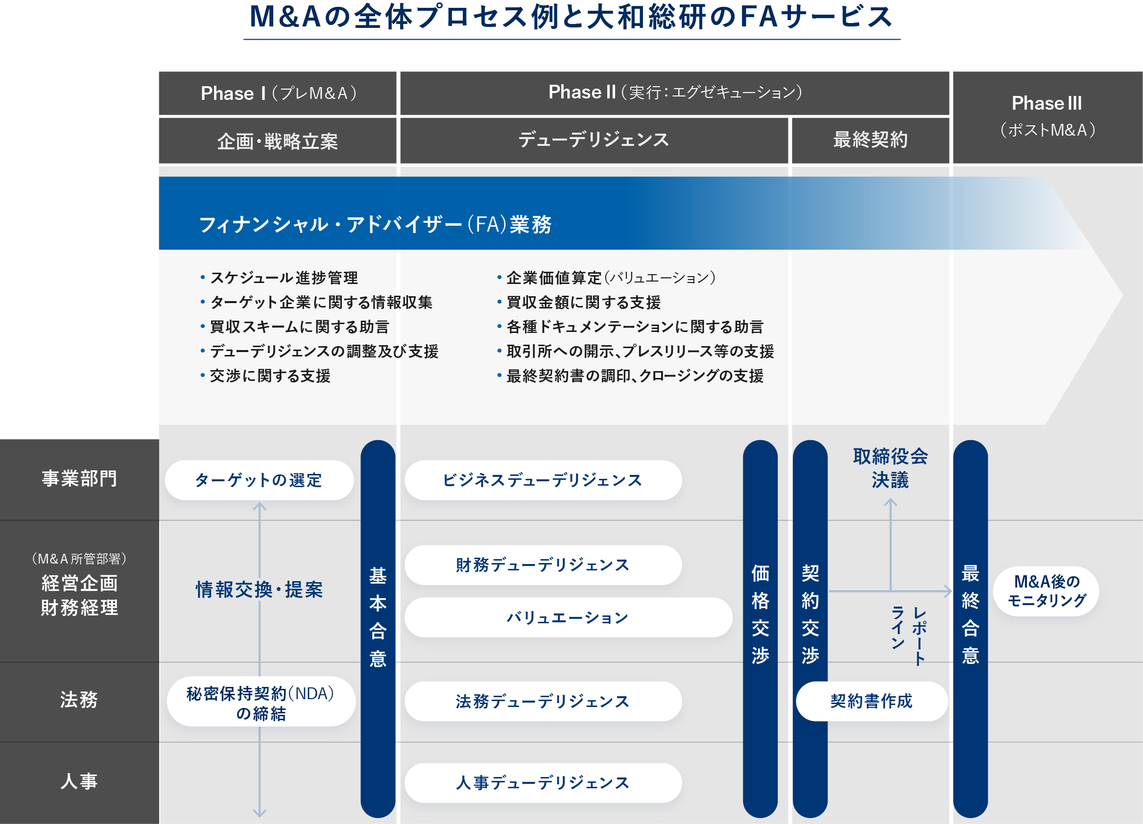 大和総研は、経営コンサルティング案件を通じて培った知見に加え、大和証券グループのシンクタンクとしての分析力や資本市場に対する深い洞察力を活かし、高度なフィナンシャル・アドバイザー(FA)業務を提供します。