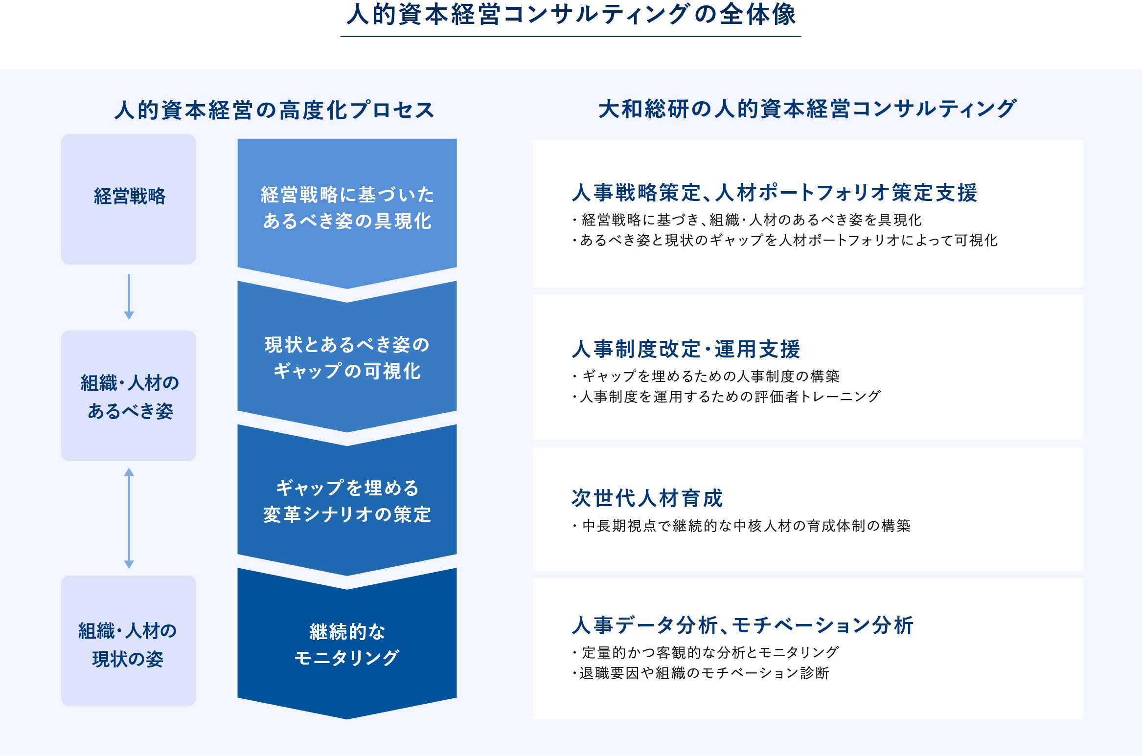 大和総研では、企業価値向上を支える人的資本経営の高度化に向け、組織風土を尊重しつつ、経営ビジョン・中期経営計画策定支援との連動やデータアナリティクス部門との連携を活かした伴走支援を行います。