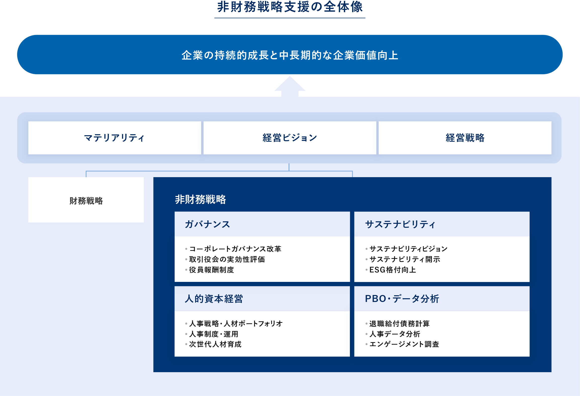大和総研は、コーポレートガバナンス、サステナビリティ、人的資本経営、データ分析・PBO計算の領域において、専門のコンサルタントが経営戦略等と連動した非財務価値の向上を支援しています。