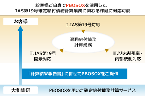 IAS第19号(従業員給付)に準拠した確定給付債務(DBO)等の評価を行う計算サービスをご提供いたします。ご提供いただいたデータを基に大和総研でDBOを計算し、計算結果報告書と併せて、計算ソフト『PBOSOX』もお客様にご提供いたします。