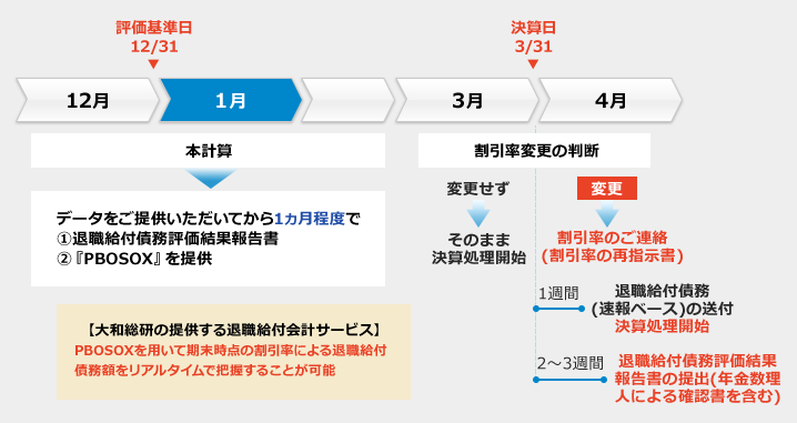 これまでの簡便法と異なり、あらかじめ定めた決算日前の基準日のデータを用いて計算することが一般的です。外部の計算機関とのやり取りや、次年度予算策定のタイミングとの兼ね合いから余裕を持ったスケジュールを考えておく必要があります。