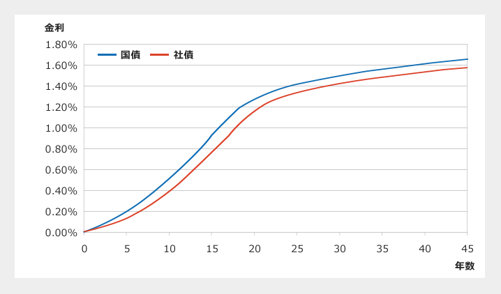 この基準に沿って割引率を設定するには、期間の異なるスポットレートの集合であるイールドカーブが必要となります。スポットレートとは、割引債(期中での利息の支払いがなく満期での支払いのみを約束する債券)の利回りですが、長期の割引債は市場に流通していないため、イールドカーブは市場に流通している利付債から金利期間構造モデルを用いて理論的に推定・作成することになります。