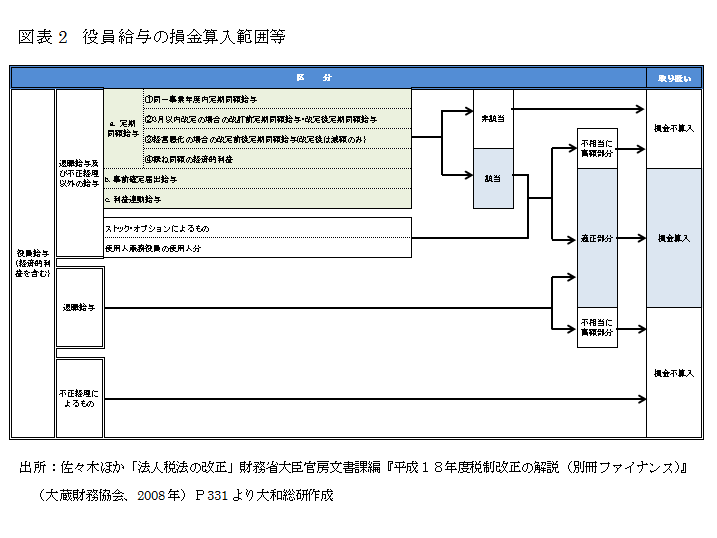同法第34条第1項において損金不算入となる給与部分(a.定期同額給与、b.事前確定届出給与、c.利益連動給与のいずれにも当たらない部分)が明示されている。これまでは、役員給与の損金算入を安易に認めると「課税の公平の観点」から問題があるとされていた。