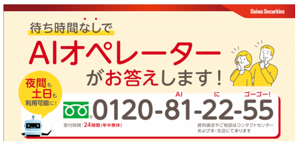 2024年に新NISA制度が開始し、資産形成に新たな関心を持つお客さまからのお問い合わせが増加傾向にあるなか、大和証券株式会社はお客さまの声に十分にお応えしていくために、株価、ニュース等のマーケット情報や、ログイン手続き、NISA関連等の一般的なお問い合わせに、AIが音声で応対するサービスとして、「大和証券AIオペレーター」を2024年10月7日に提供開始いたしました。以降、利用可能時間を年中無休へ拡大する等、継続してサービス拡充に取り組み、これまで多くのお客さまにご利用いただいております。