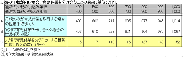 夫婦の年収が同程度であるならば、夫婦で育児休業を分け合うと、母親のみが育児休業を取る場合よりも、下表のように、世帯手取り収入は増加する。