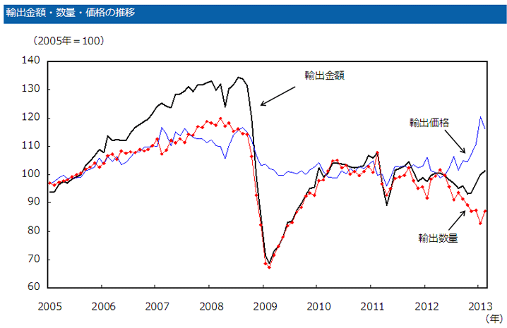 昨年末以降の円安の進展にもかかわらず、輸出数量は依然緩やかな減少が続いている。しかし一方で、輸出金額は昨年10月を底に持ち直しており、それは取りも直さず、輸出価格が大幅に上昇しているためである。景気を考える上では実質ベースの動きが重視され、輸出価格への注目度はそれほど高くないが、足下の円建て輸出価格の動向を見てみると、急激な円安を背景に、実は過去最高水準まで上昇している。円安によって国内における相対的な生産コストが割安になっているにもかかわらず、契約通貨建て輸出価格は引き下げられていない。