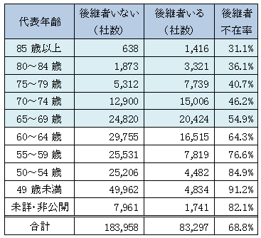 事業承継に関して、帝国データバンクが公表した「第2回全国オーナー企業分析」によると、オーナー企業26万7,255社のうち68.8%(18万3,958社)もの企業が直面しているとのことである。また、年齢別に見ると65歳以上のオーナーでは48.7%が後継者不足であることが判明したほか、事業承継の準備を始めるべき60歳前後のオーナーでも7割近い不在率となっているとのことである。