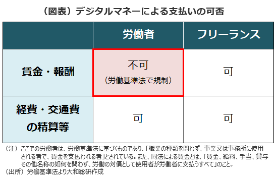 まず一つ目は、すでにデジタル給与で支払われているケースがあるのではないかというものである。この指摘については、その通りという回答になる。解禁前なのにデジタル給与で支払われているというのは、一見矛盾したような話であるが、この理由は至ってシンプルである。下記の図表で示したように、現在議論されているのは、労働者の賃金支払いに対する規制であり、その対象とならないフリーランスの報酬はすでにデジタル給与で支払うことができる。なお、労働者についても、経費・交通費の精算等でデジタルマネーを利用することは可能である。