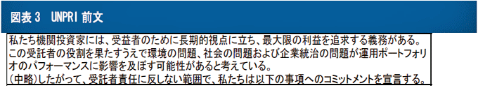 ESG投資を行おうとする際、一種の懸念事項としてたびたび指摘されてきたのが、受託者責任との相克の問題だ。これについて、UNPRIでは、前文において「資産運用の受益者の利益を最大限に考慮すべき」という伝統的な受託者責任を明記した上で、ESG要因が投資パフォーマンスに影響する可能性があるというUNPRIの大前提を示している(図表3)。ESG要因がパフォーマンスに影響する以上、当該要素について考慮することも受託者責任に含まれるという建て付けだ。ESG投資の普及促進には受託者責任のクリアがポイントの一つだが、UNPRIが拡大している背景には、UNPRIが伝統的な受託者責任に対し、その定義を新たに明確にした上で、ある種の制度的担保として機能している面も指摘できるだろう。