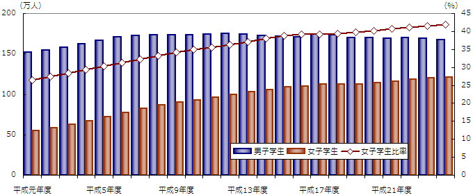 図表1が、大学の学部や大学院に在籍する男女別の学生数と、学生全体に対する女子学生の占める割合(女子学生比率)について、平成元年度から平成24年度までの推移を図示したものである。直近の平成24年度では、男子学生は前年度比-1.4%の167万人、女子学生は前年度比+0.5%の120万6千人であった。男子学生が減少しているのに対し、女子学生は増加していることから、女子学生比率は前年度から0.5%ポイント増の41.9%となった。