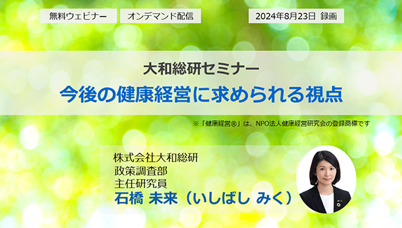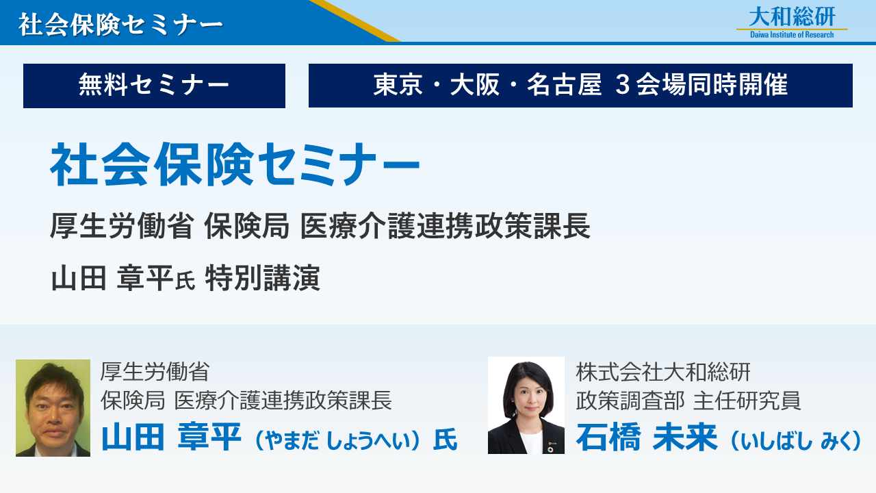 大和総研 社会保険セミナー(厚生労働省 保険局 医療介護連携政策課長 山田 章平氏:「健康保険組合と事業主をつなぐコラボヘルス、Well-being、医療介護連携などに関する情報提供」/株式会社大和総研 政策調査部 主任研究員 石橋 未来:「今後の健康経営に求められる視点~事業主と保険者への期待~」)