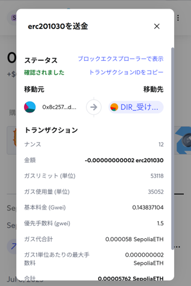 「erc2030を送金」をクリックすると、送金履歴の詳細を確認できます。(図20)。